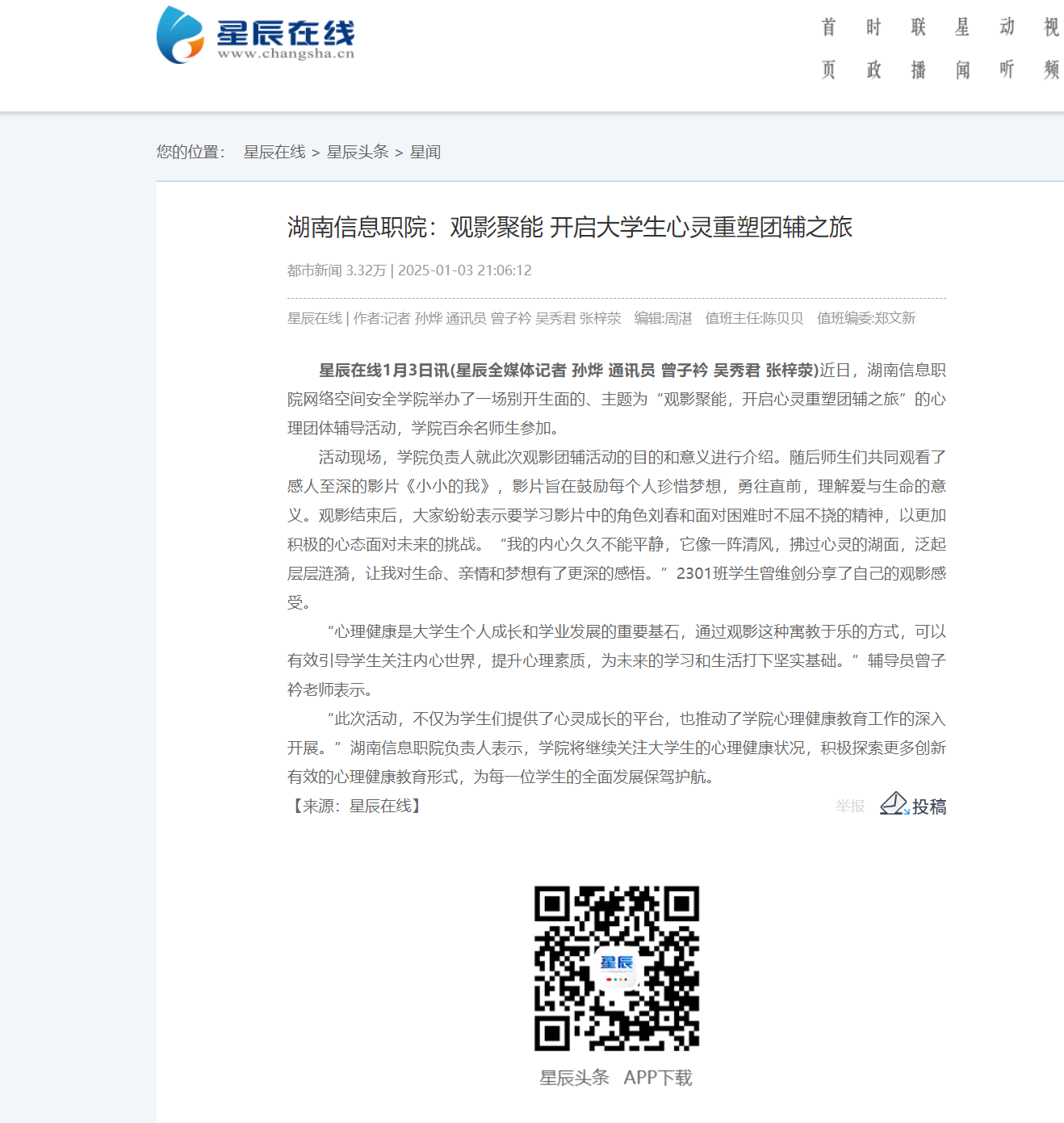 1月3日,星辰在线发布《湖南信息职院:观影聚能 开启大学生心灵重塑团辅之旅》。