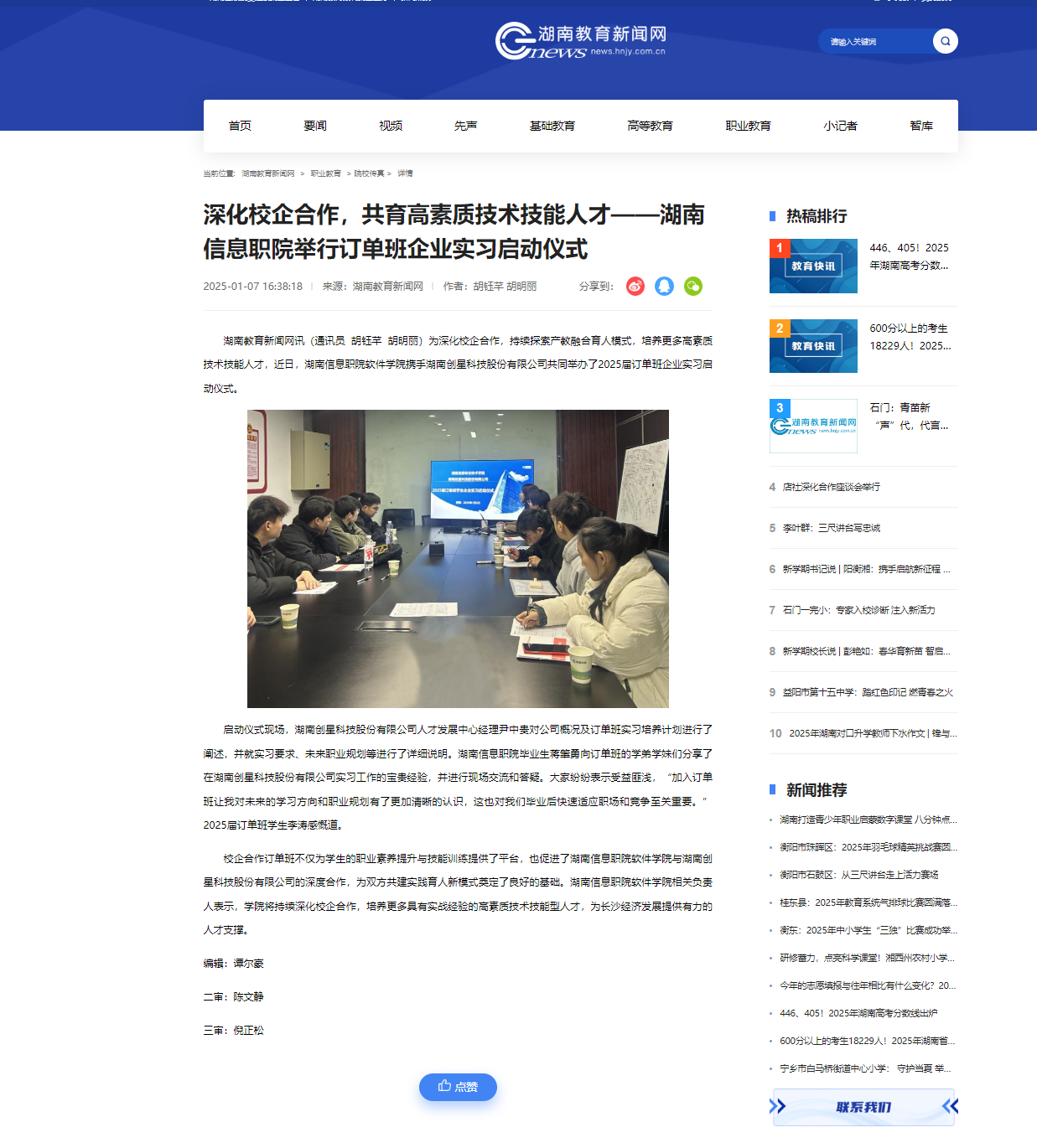 1月7日,湖南教育新闻网发布《共育高素质技术技能人才——湖南信息职院举行订单班企业实习启动仪式》。