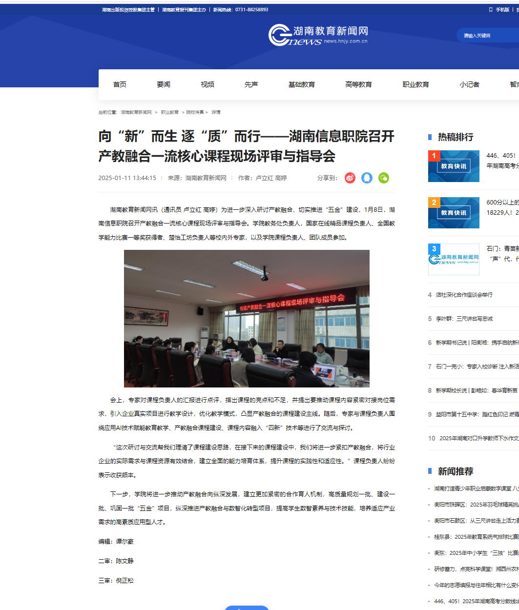 1月11日,湖南教育新闻网发布《向“新”而生 逐“质”而行——湖南信息职院召开产教融合一流核心课程现场评审与指导会》。