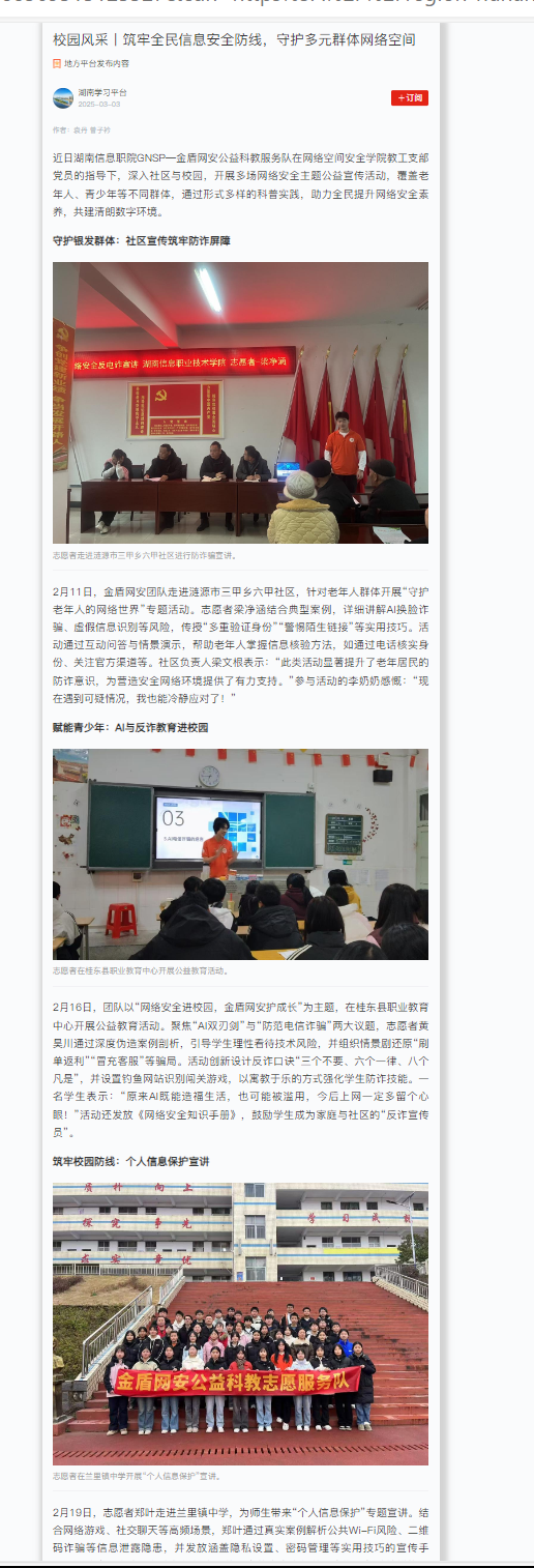 3月3日,学习强国发布《校园风采丨筑牢全民信息安全防线,守护多元群体网络空间》。