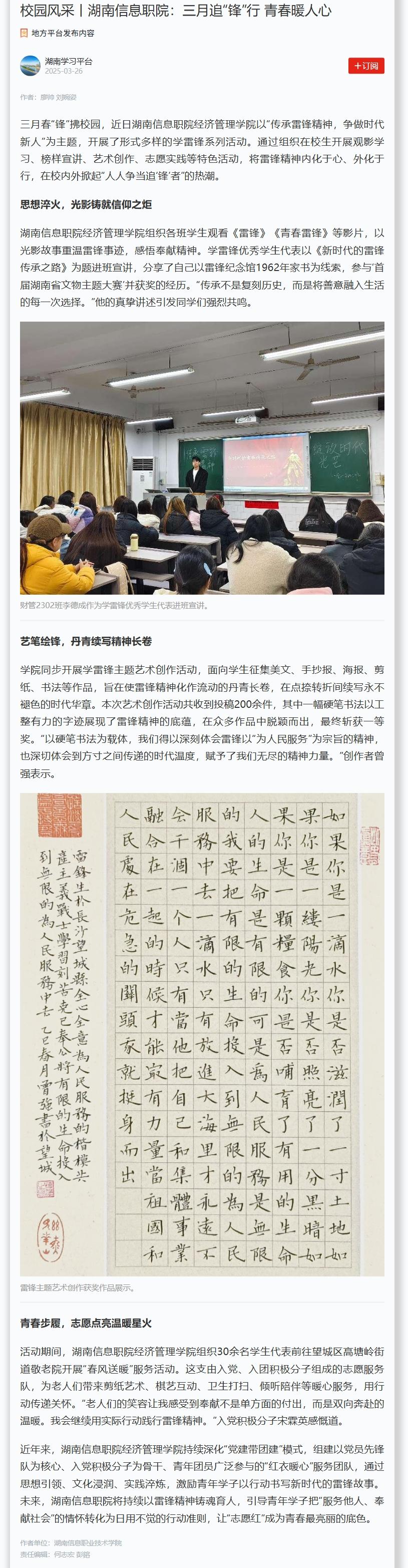 3月26日,学习强国发布《校园风采丨湖南信息职院:三月追“锋”行 青春暖人心》。