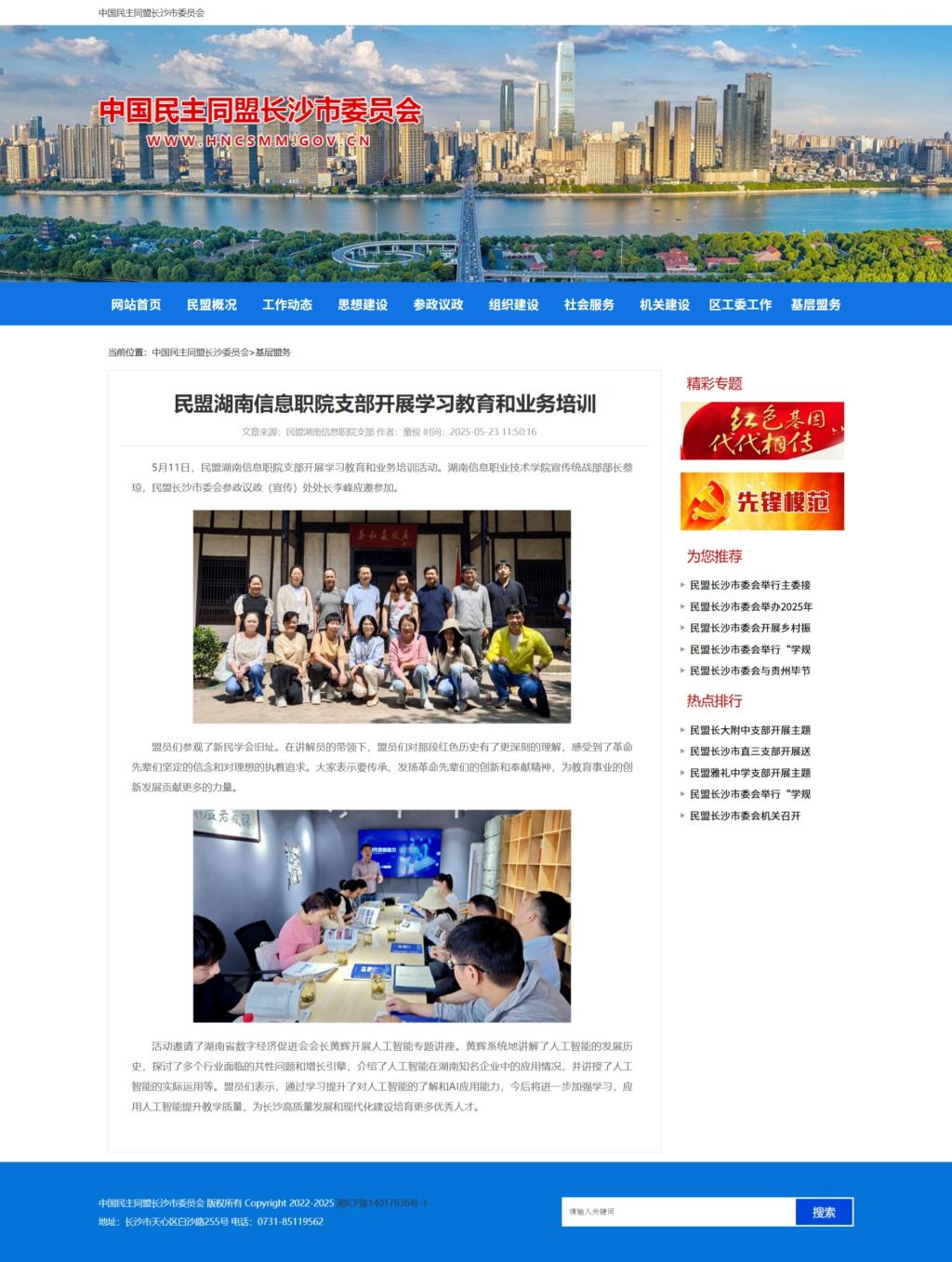 5月23日,中国民主同盟长沙委员会发布《民盟湖南信息职院支部开展学习教育和业务培训》