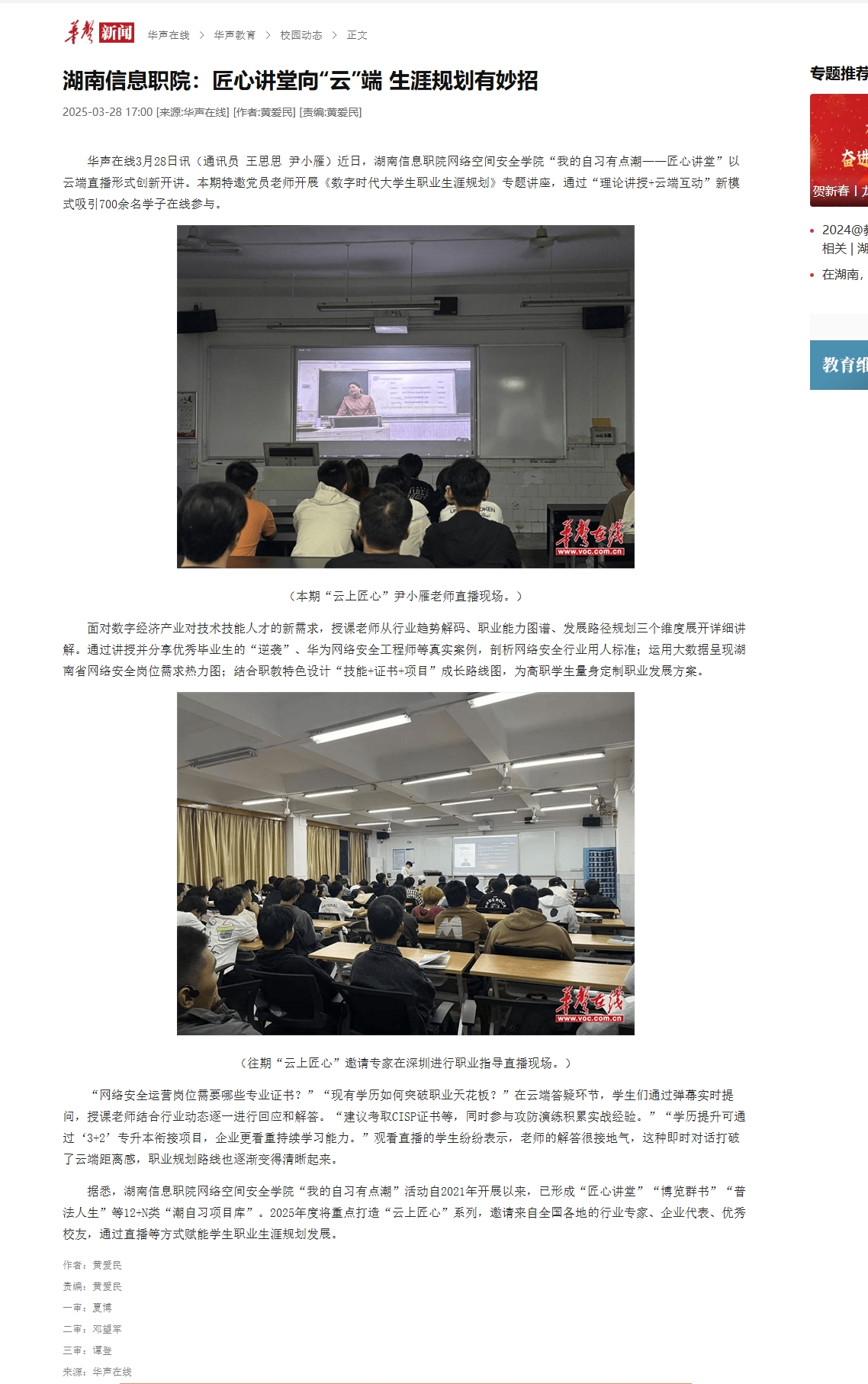 3月28日,华声在线发布《湖南信息职院:匠心讲堂向“云”端 生涯规划有妙招》。