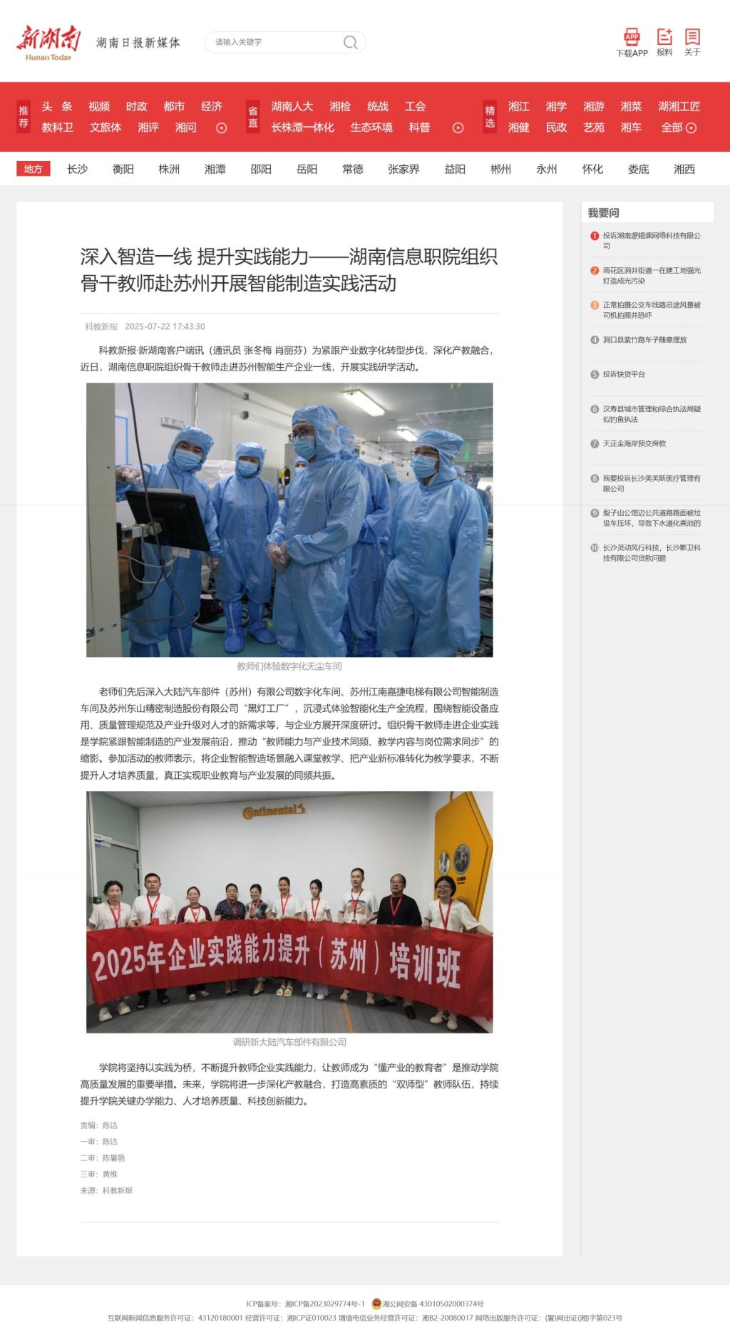 7月22日,新湖南发布《深入智造一线 提升实践能力——湖南信息职院组织骨干教师赴苏州开展智能制造实践活动》