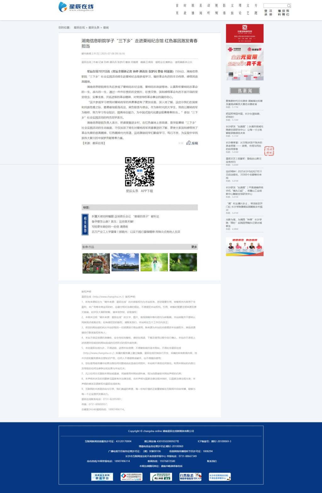 7月8日,星辰在线发布《湖南信息职院学子“三下乡”走进粟裕纪念馆 红色基因激发青春担当》