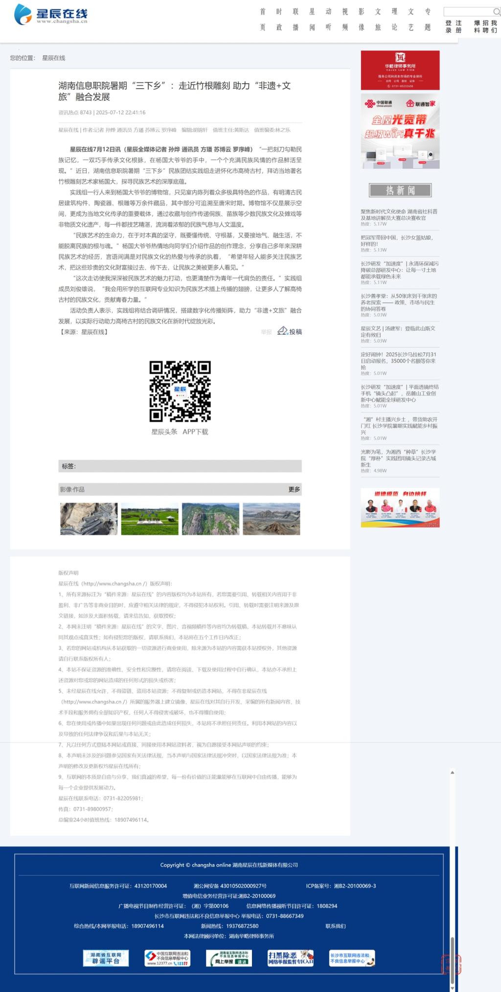 7月12日,星辰在线发布《湖南信息职院暑期“三下乡”:走近竹根雕刻 助力“非遗+文旅”融合发展》