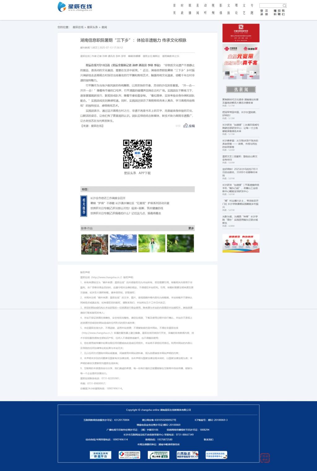 7月13日,星辰在线发布《湖南信息职院暑期“三下乡”:体验非遗魅力 传承文化根脉》