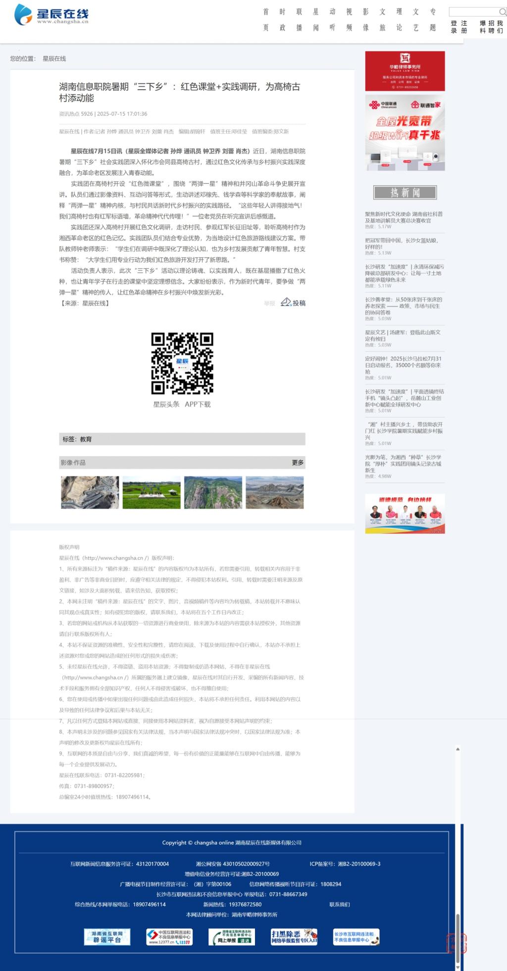 7月15日,星辰在线发布《湖南信息职院暑期“三下乡”:红色课堂+实践调研,为高椅古村添动能》