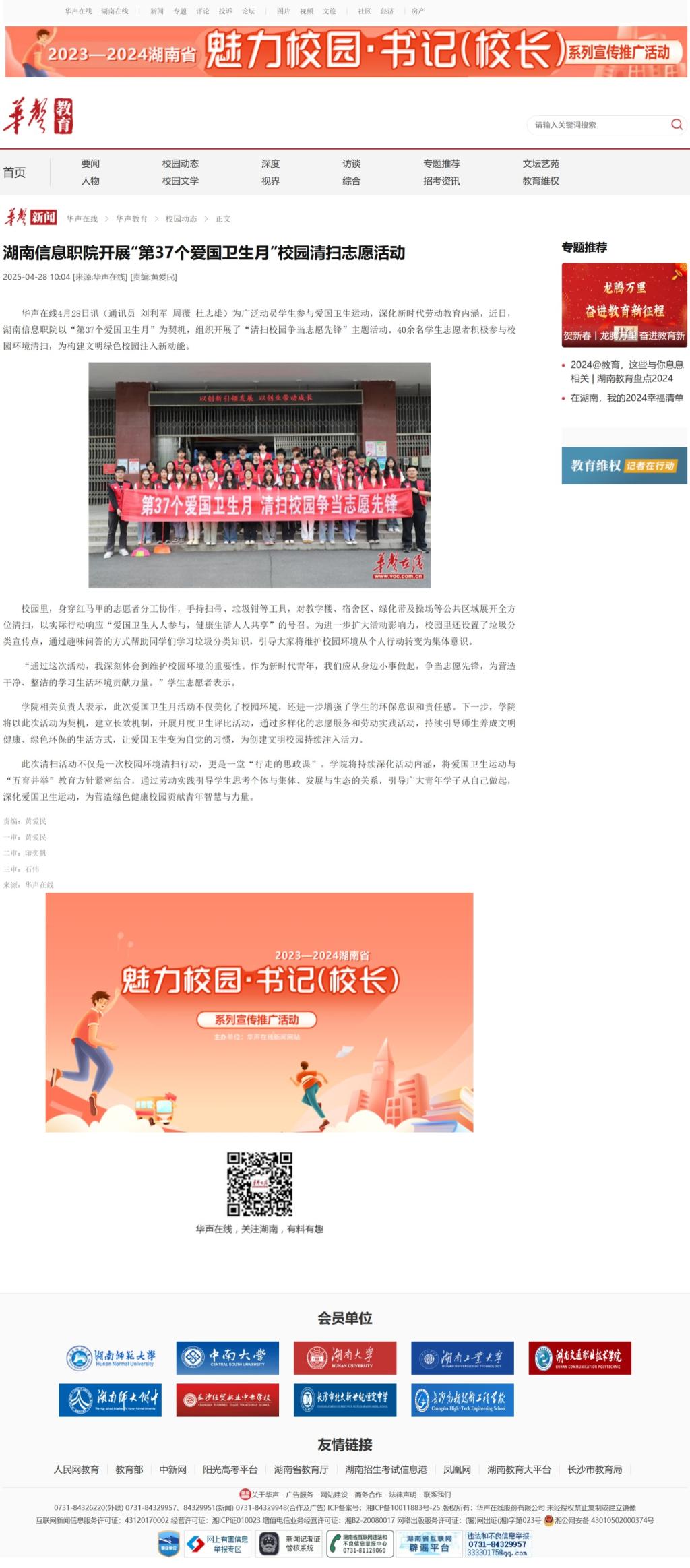 4月28日,华声在线发布《湖南信息职院开展“第37个爱国卫生月”校园清扫志愿活动》