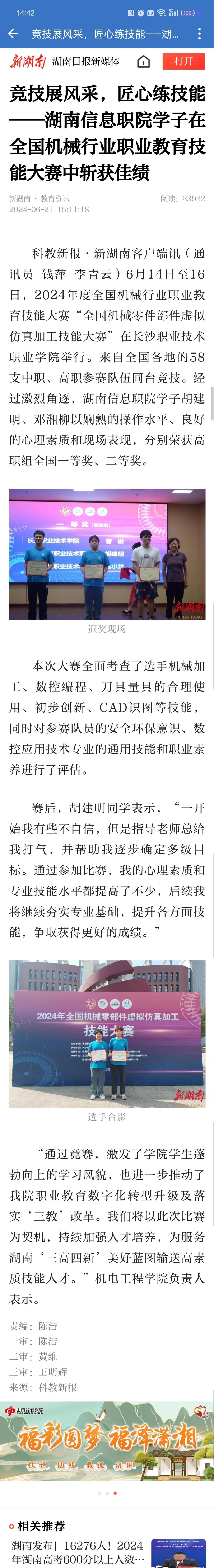 6月21日,新湖南发布《竞技展风采,匠心练技能——湖南信息职院学子在全国机械行业职业教育技能大赛中斩获佳绩》