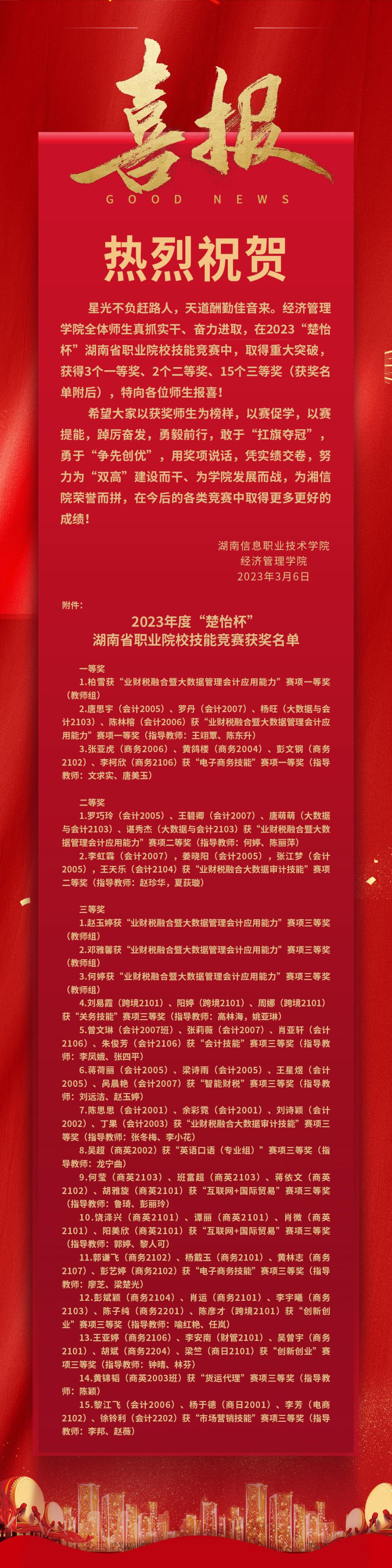 喜报:经济管理学院在2023“楚怡杯”湖南省职业院校技能竞赛中获得3个一等奖、2个二等奖、15个三等奖!