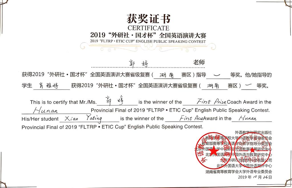 湖南省英语演讲比赛一等奖