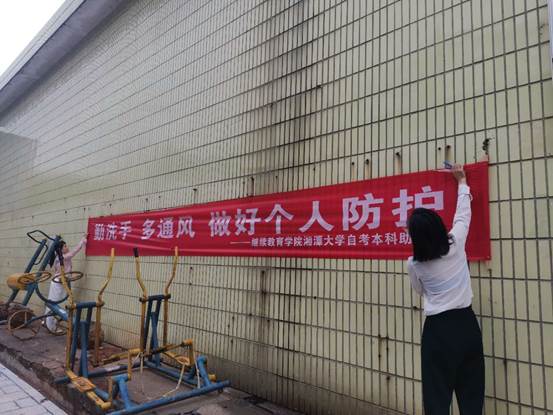 上图为湘潭大学自考助学点工作人员在张贴防疫宣传横幅