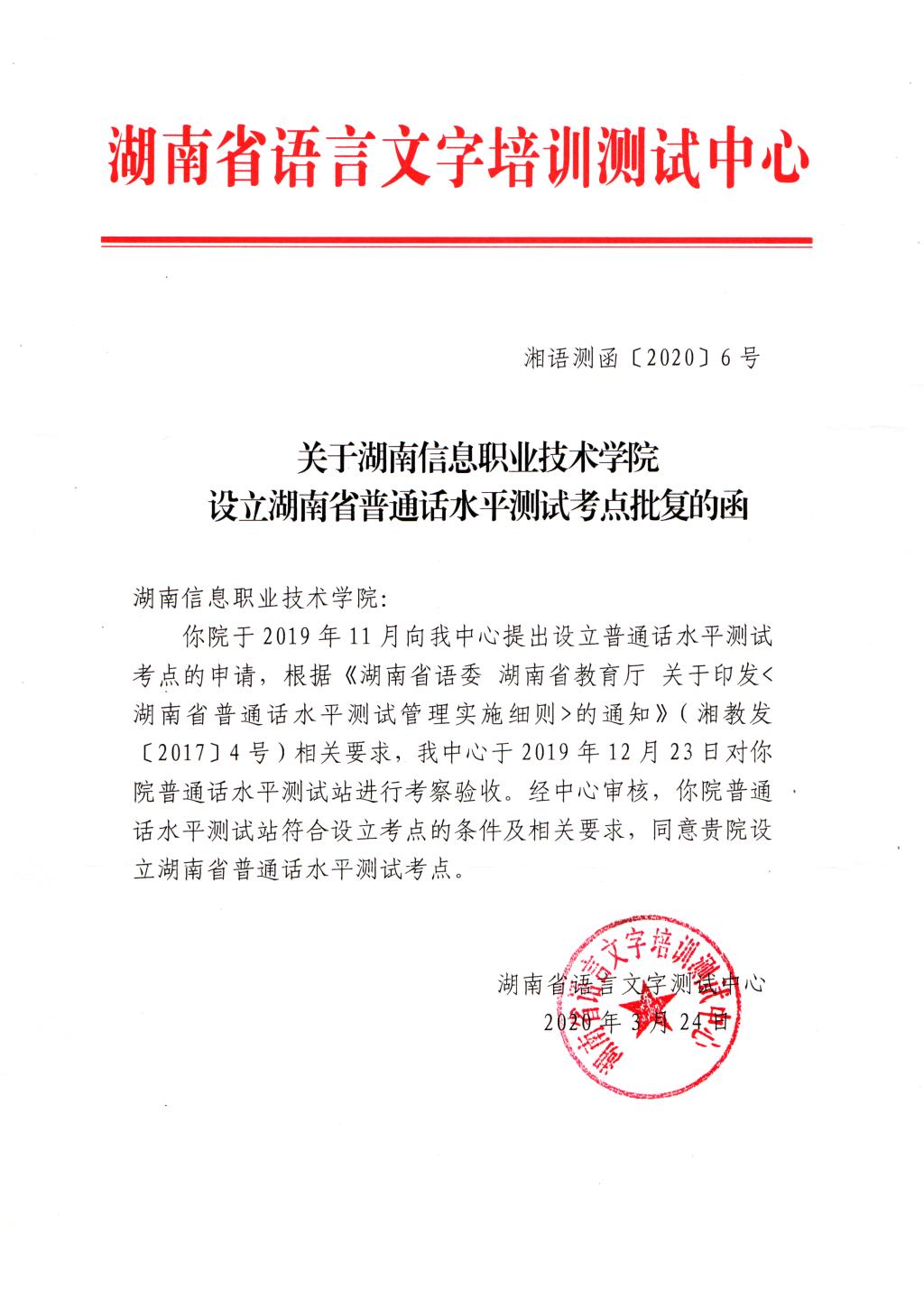 经湖南省语言文字培训测试中心批准,同意在beat365设立普通话水平测试考点《关于beat365官方网站设立湖南省普通话水平测试考点批复的函(湘语测函〔2020〕6号)》。以后,beat365可开展面向全体在籍学生的普通话水平测试。