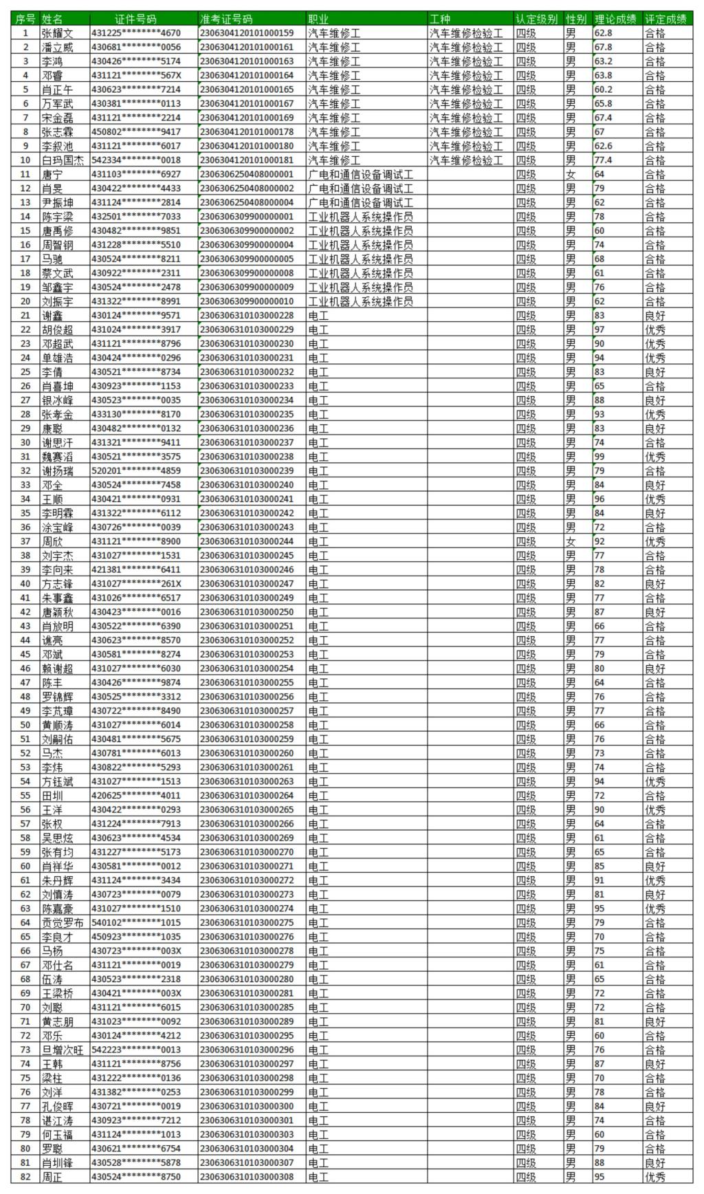 继续教育学院于2023年6月30日开展了电工(四级)、工业机器人系统操作员(四级)、广电和通信设备调试工(四级)、汽车维修工(四级)(批次号为:230603beat365官方网站等级认定(第3批))职业技能等级认定。评价方式为理论考试。现依规对成绩进行公示(详见附件)。