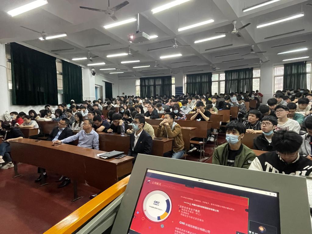 长城信息股份有限公司的陈小波经理首先向同学们介绍了公司的概况和运营情况,长城信息股份有限公司成立于2007年02月06日,位于长沙经济技术开发区东3路5号,是中国电子旗下中国长城的控股子公司,公司集安全高端金融机具、软硬件集成方案、影印外设的研发、生产、销售和服务于一体,主营产品广泛应用于各大银行和政务、保险、税务、社保等行业,是国内主流的金融信息技术解决方案提供商和设备供应商。