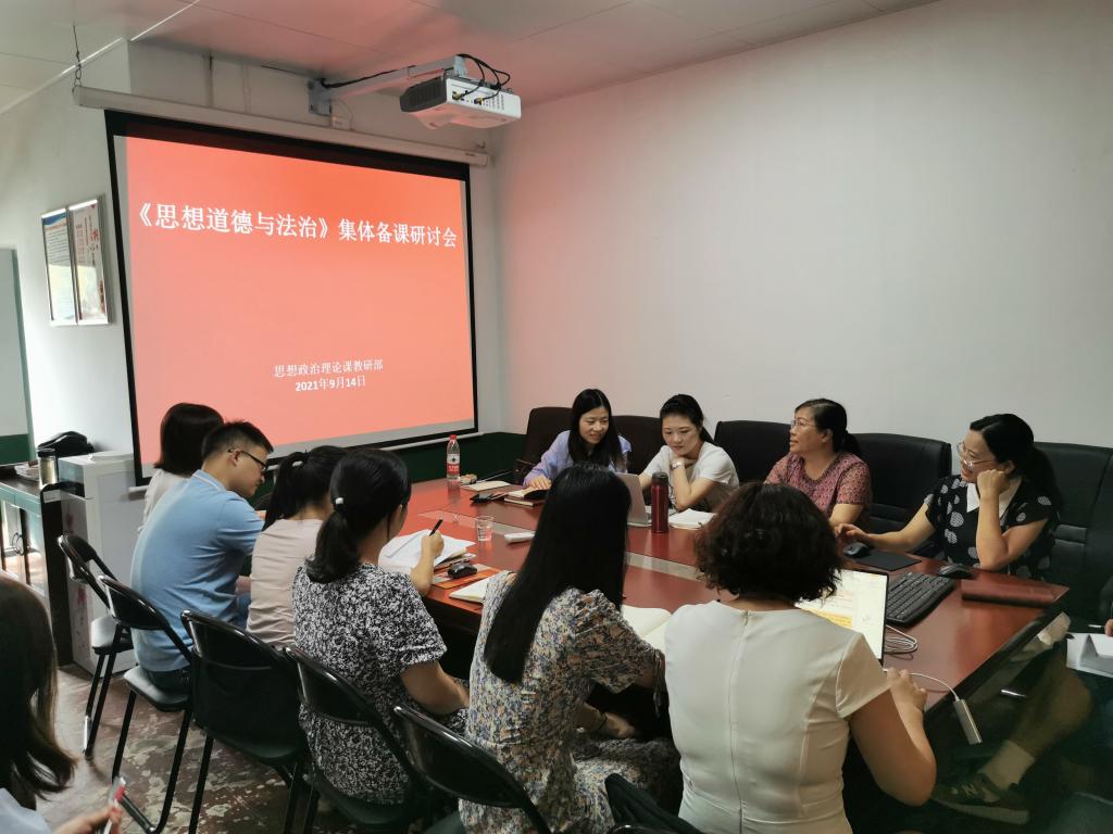怎样讲好开学第一课?新课程如何设计?思政课教学如何吸引00后学生?集体备课通过自由讨论、疑难问题共研等环节,思政课教师进行了深入交流研讨。各章节负责的老师依次分享了实践拓展案例的选取、章节备课思路以及新旧教材差异的分析和教学处理。另外,老师们也把暑期实践研修开发的教学案例自觉融入到教学中。