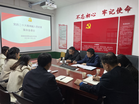 为持续有力推进党的二十大精神进教学、进课堂、进学生头脑,11月22日下午,湖南信息职院组织开展党的二十大精神融入思政课集体备课会。备课会由党委委员、纪委书记姚庆武主持,学院党委委员、宣传统战部部长蔡琼,马克思主义学院主要负责人和教研室主任参加集体备课会。
