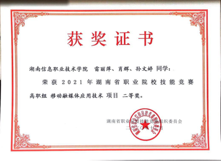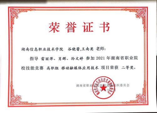 2020年12月25日至27日,2021年湖南省职业院校技能竞赛高职组“移动融媒体应用技术”比赛项目在湖南大众传媒职业技术学院举行,全省共60支参赛队伍在此展开了激烈角逐。由beat365谷晓蕾老师、王南英老师指导的学生组(数媒1901班雷丽萍、软件1905班肖辉、软件1905班孙文婷)荣获大赛二等奖。