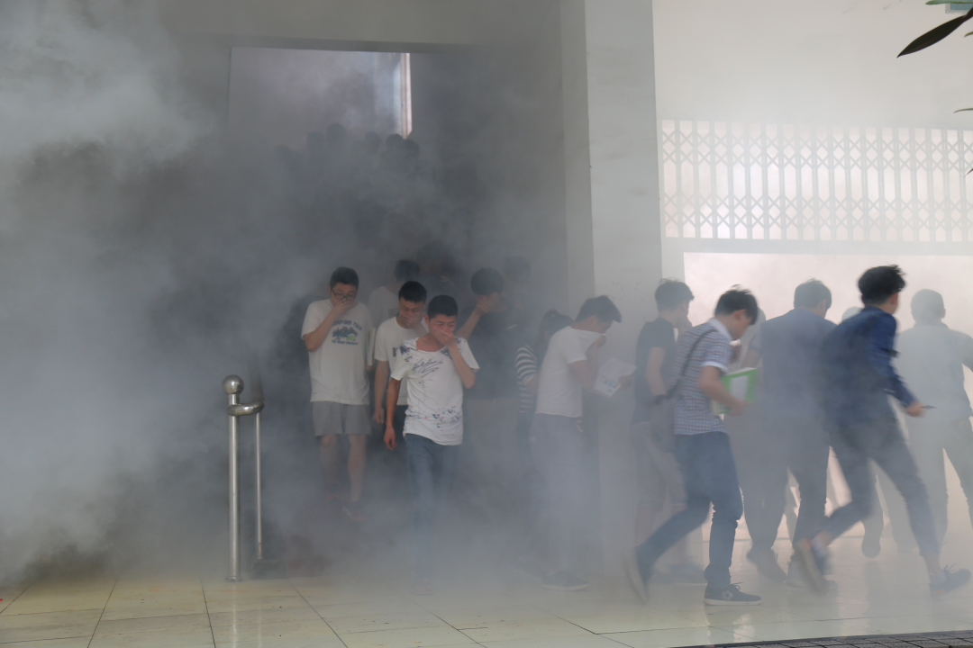 上午10时00分,一阵尖锐的警报声打破了南院教学楼的寂静,发生“火灾”了!浓烟扩散开来,空气中弥漫着呛人的气味!“全体师生请注意,学校教学楼发生火灾,请所有人员立即按学校《消防逃生应急预案》各就各位,展开行动!”学院广播里传来应急疏散演习总指挥的声音。教学楼内近千名学生在老师们的带领下,捂住口鼻,秩序井然地从教学楼内疏散到“安全地带”,整个过程仅用了短短1分56秒。