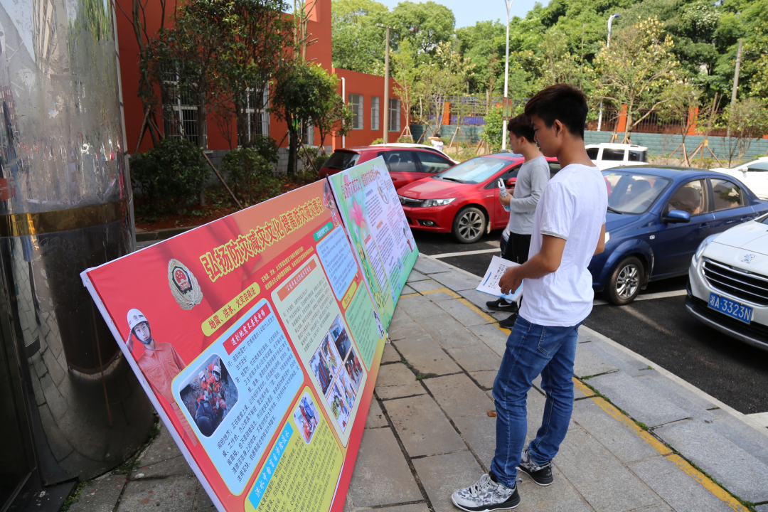 学生认真学习有关防灾减灾的宣传板