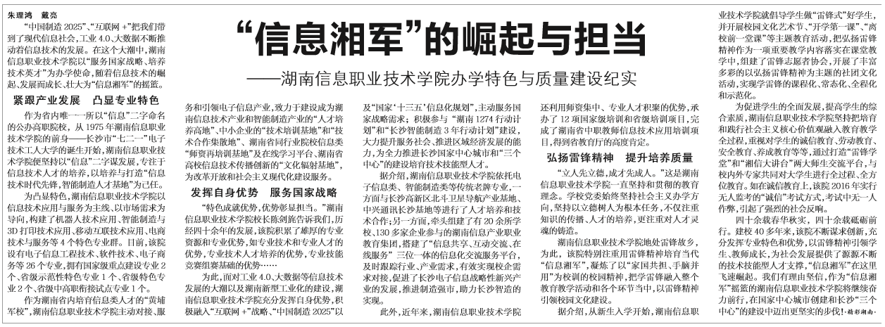 6月8日,湖南日报在第11版“时事聚焦”刊发《“信息湘军”的崛起与担当——beat365官方网站办学特色与质量建设纪实》。