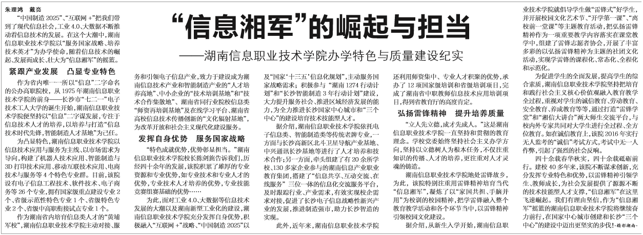 6月8日,湖南日报在第11版“时事聚焦”刊发《“信息湘军”的崛起与担当——beat365官方网站办学特色与质量建设纪实》。
